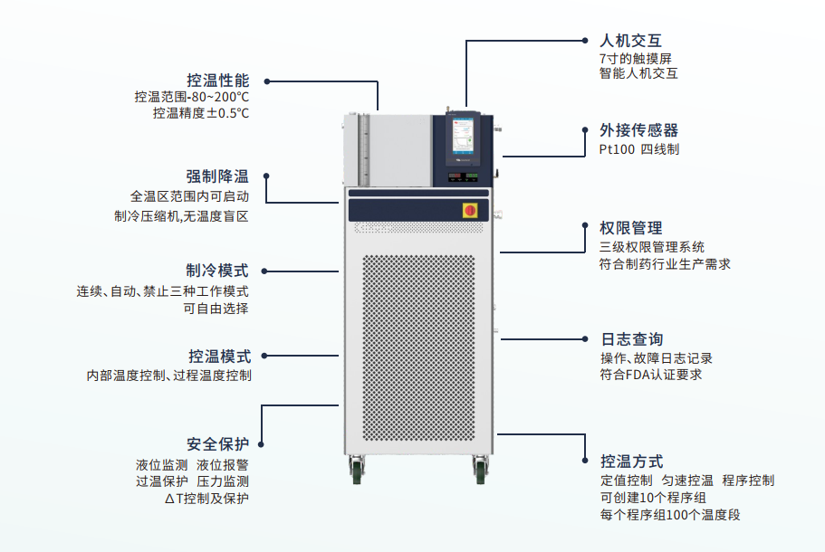高低溫一體機(jī)廣泛應(yīng)用于各個(gè)領(lǐng)域,如實(shí)驗(yàn)室中的樣品處理、物料穩(wěn)定性測(cè)試;化工領(lǐng)域中的反應(yīng)釜、反應(yīng)器的加熱和冷卻;電子行業(yè)中的元器件測(cè)試和老化實(shí)驗(yàn);生物醫(yī)藥設(shè)備的溫度控制等,其靈活性和可靠性使其成為許多行業(yè)中不可或缺的設(shè)備。